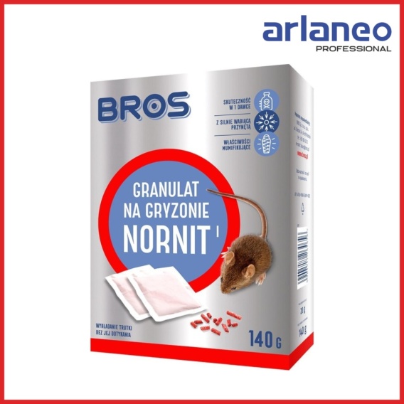 BROS NORNIT to wysokogatunkowy granulat do skutecznego zwalczania gryzoni. Preparat długo utrzymuje świeżość i atrakcyjność pokarmową, co zwiększa efektywność działania.