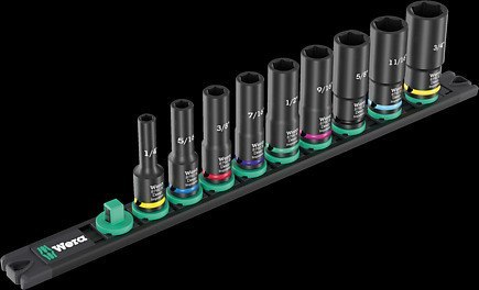 Listwa magnetyczna z 9 długimi kluczami nasadowymi Impaktor, 3/8". Technologia Impaktor umożliwia uzyskanie ponadprzeciętnej żywotności narzędzi nawet w wymagających warunkach pracy. Wersja długa do głęboko osadzonych połączeń śrubowych i wystających prętów gwintowanych. Profil sześciokątny pozwala na przenoszenie dużych sił i w mniejszym stopniu obciąża krawędzie nakrętki lub łba śruby niż profil dwunastokątny. System oznaczenia kolorystycznego kluczy według rozmiaru "Take it easy" ułatwiający i przyspieszający odnajdywanie właściwego narzędzia. Listwa magnetyczna umożliwia krótkotrwałe mocowanie do metalowych powierzchni, a dzięki funkcji twist to unlock zapewnia bezpieczne blokowanie i odblokowywanie kluczy nasadowych.