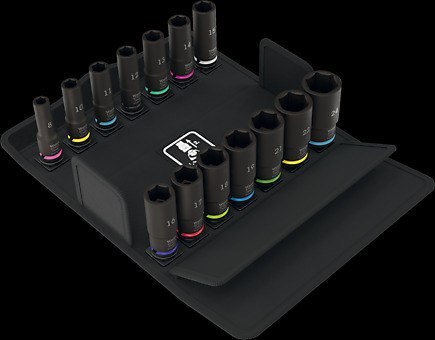 Zestaw z 14 kluczami nasadowymi Impaktor Deep do stosowania z elektrycznymi lub pneumatycznymi wkrętarkami udarowymi 3/8". Wersja długa do głęboko osadzonych połączeń śrubowych i wystających prętów gwintowanych. Technologia Impaktor umożliwia uzyskanie ponadprzeciętnej żywotności narzędzi nawet w wymagających warunkach pracy. Profil sześciokątny umożliwia przenoszenie dużych sił z zachowywaniem precyzji i zabezpieczeniem profilu. System oznaczenia kolorystycznego kluczy według rozmiaru "Take it easy" ułatwiający i przyspieszający odnajdywanie właściwego narzędzia.