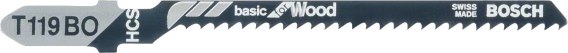 Brzeszczot T 119 BO Bosch do wyrzynarki, idealny do cięć krzywoliniowych w drewnie. Wąskie ostrze i faliste zęby zapewniają precyzyjne i łatwe prowadzenie cięcia. Pasuje do wyrzynarek z uchwytem typu T.