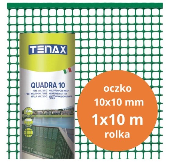 Siatka ochronna ogrodzeniowa plastikowa Quadra 10, wymiary rolki 1x10 m, oczko 10x10 mm, zielona TENAX.