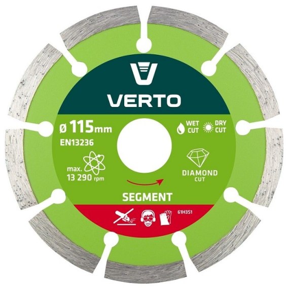 Tarcza diamentowa segmentowa VERTO (nr ref. 61H3S1) o średnicy zewnętrznej 115 mm pozwala wydajnie ciąć elementy wykonane z betonu, betonu zbrojonego, granitu, marmuru, kamienia, cegły itp. Marka VERTO oferuje asortyment elektronarzędzi i akcesoriów dla każdego majsterkowicza.