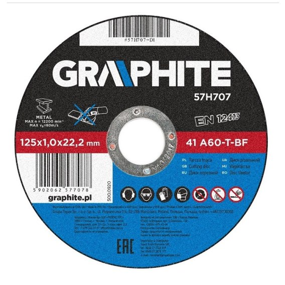 Tarcza do cięcia metalu GRAPHITE (nr ref. 57H707) o średnicy zewnętrznej 125 mm, dzięki zaawansowanej konstrukcji i redukcji grubości pozwala znacząco skrócić czas cięcia. Zapewnia wysoki poziom bezpieczeństwa pracy dzięki zgodności produktu z normą EN12413.