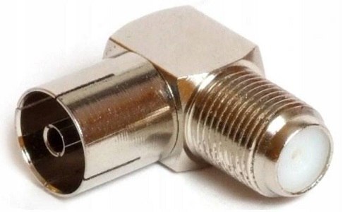 Przejściówka z wtyku antenowego IEC stosowanego w TV naziemnej na gniazdo F, wersja kątowa, metalowa.