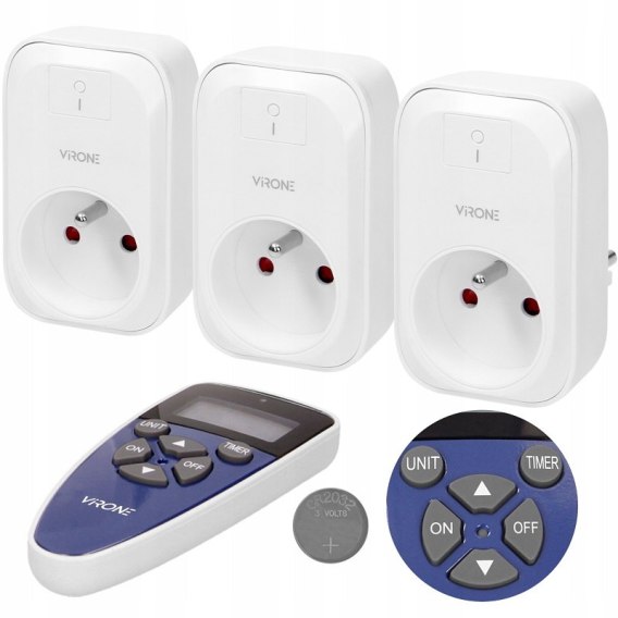 Zestaw gniazd Virone RS-1 umożliwia bezprzewodowe sterowanie (tj. włączanie / wyłączanie) urządzeniami elektrycznymi (np. lampami, wentylatorami itp.) za pomocą pilota (nadajnika) z funkcją timera i zegara. Posiada zasięg działania do 30 m