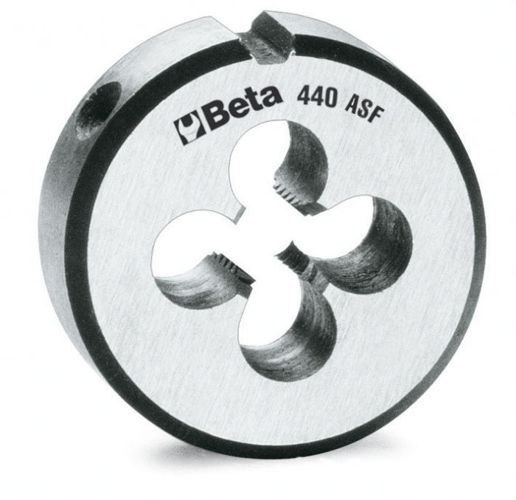 Beta Narzynka okrągła, gwint calowy UNF, stal chromowa 5/16 towysokiej jakości produkt z rodziny narzędzi skrawających. Narzynka z wyglądu przypomina krążek z otworami w środku, wyposażony w ostrza do tworzenia gwintów zewnętrznych. Wykorzystywana jest razem ze specjalnymi oprawkami i pozwala na stworzenie gwintu zewnętrznego na metalowych walcach i prętach. Możliwe jest tworzenie gwintów metrycznych, calowych i specjalnych. Jest to narzędzie wykorzystywane zarówno do profesjonalnej pracy w zakładach przemysłowych, jak i amatorskiego tworzenia elemenów mocujących śrubowych w dowolnych konstrukcjach.
