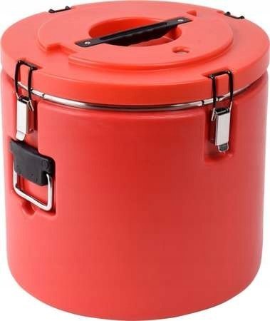 ędzi cateringowych do przechowywania żywności. W termosie zastosowano również specjalny zawór dekompresyjny, który ułatwia otwarcie i eliminuje problem zasysania pokrywki przy przewożeniu gorących produktów. Wyrównanie ciśnienia uzyskujemy po naciśnięciu zaworu. Dodatkowo w pojemniku zamontowano uszczelkę wykonaną z wysokiej jakości silikonu, która zapobiega rozlewaniu płynnej zawartości. Jest ona łatwa do utrzymania w czystości, dzięki możliwości demontażu oraz specjalnemu kształtowi ułatwiającemu mycie pod bieżącą wodą. Pojemnik termoizolacyjny wyposażony jest w dwa wykonane ze stali nierdzewnej, masywne uchwyty ułatwiające transport oraz cztery zatrzaski zamykające pokrywę. Wysoka jakość i wytrzymałość tych elementów, gwarantuje wieloletnie bezawaryjne użytkowanie. W termosie zastosowano specjalne wytłoczenia umożliwiające sztaplowanie, czyli piętrowanie pojemników o takiej samej średnicy, dlatego możliwe jest składowanie ich na stosunkowo niewielkiej powierzchni. Transport i magazynowanie żywności