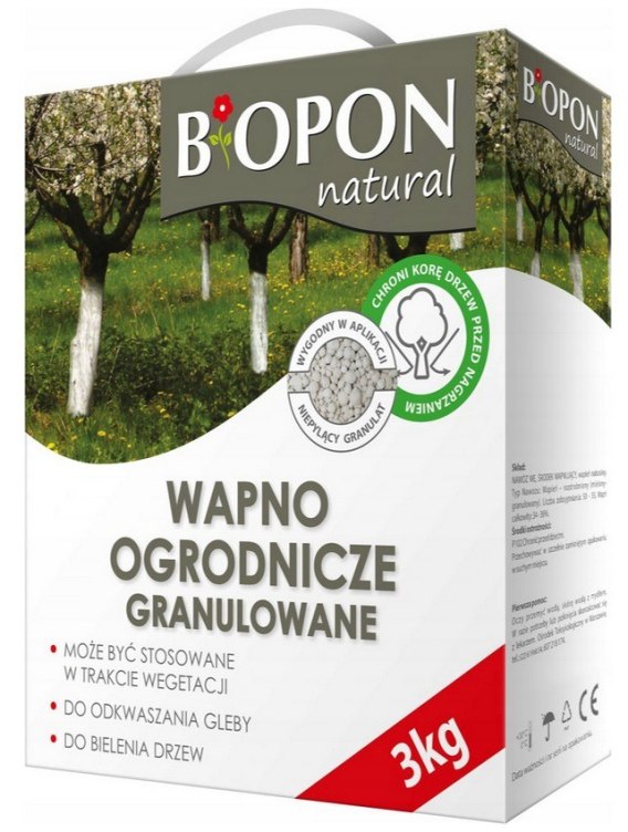 Wapno ogrodnicze w postaci wysokoreaktywnego i łatwo rozpuszczalnego w wodzie granulatu, przeznaczone zarówno do bielenia drzew, jak i do odkwaszania gleby o zbyt niskim odczynie pH.