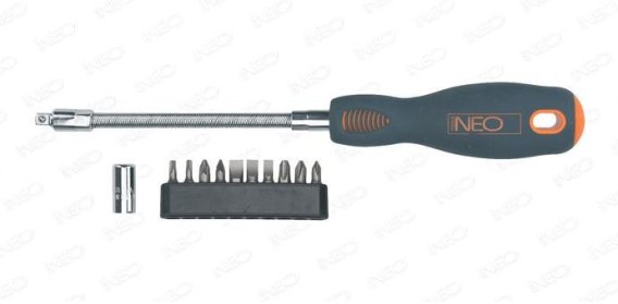 Wkrętak z giętkim grotem zawiera uchwyt, 10 końcówek wkrętakowych (płaskich, krzyżowych, Torx) i adapter.