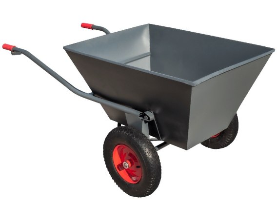 Wózek charakteryzuje się pojemną misą wykonaną z wysokiej jakości blachy, mocną spawaną konstrukcją, łatwością w manewrowaniu dzięki dwóm pompowanym kołom.