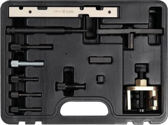Zestaw zawiera: blokadę wałka rozrządu, blokady pompy wtryskowej, blokady koła zamachowego, ściągacz koła zębatego oraz śruby blokujące.