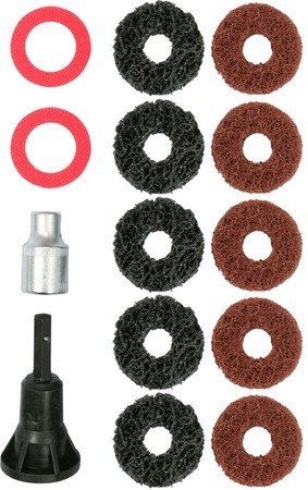 Zawartość zestawu: ściernica wymienna x10|rzep z klejem x2|trzpień prowadzący|przejściówka do klucza udarowego 1/2" (12.7 mm)