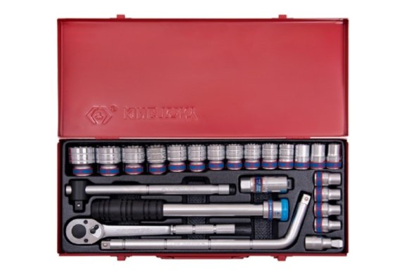 Zestaw narzędzi 1/2" King Tony w metalowej kasecie. W zestawie znajdują się nasadki krótkie, 6-kątne, nasadka do świec 21 mm 6-kątna, grzechotka wraz z przedłużką do grzechotki, pokrętło przesuwne oraz pokrętło typu L. Nasadki w rozmiarach [ mm ]: 10, 11, 12, 13, 14, 15, 16, 17, 18, 19, 20, 21, 22, 23, 24, 27, 30, 32.